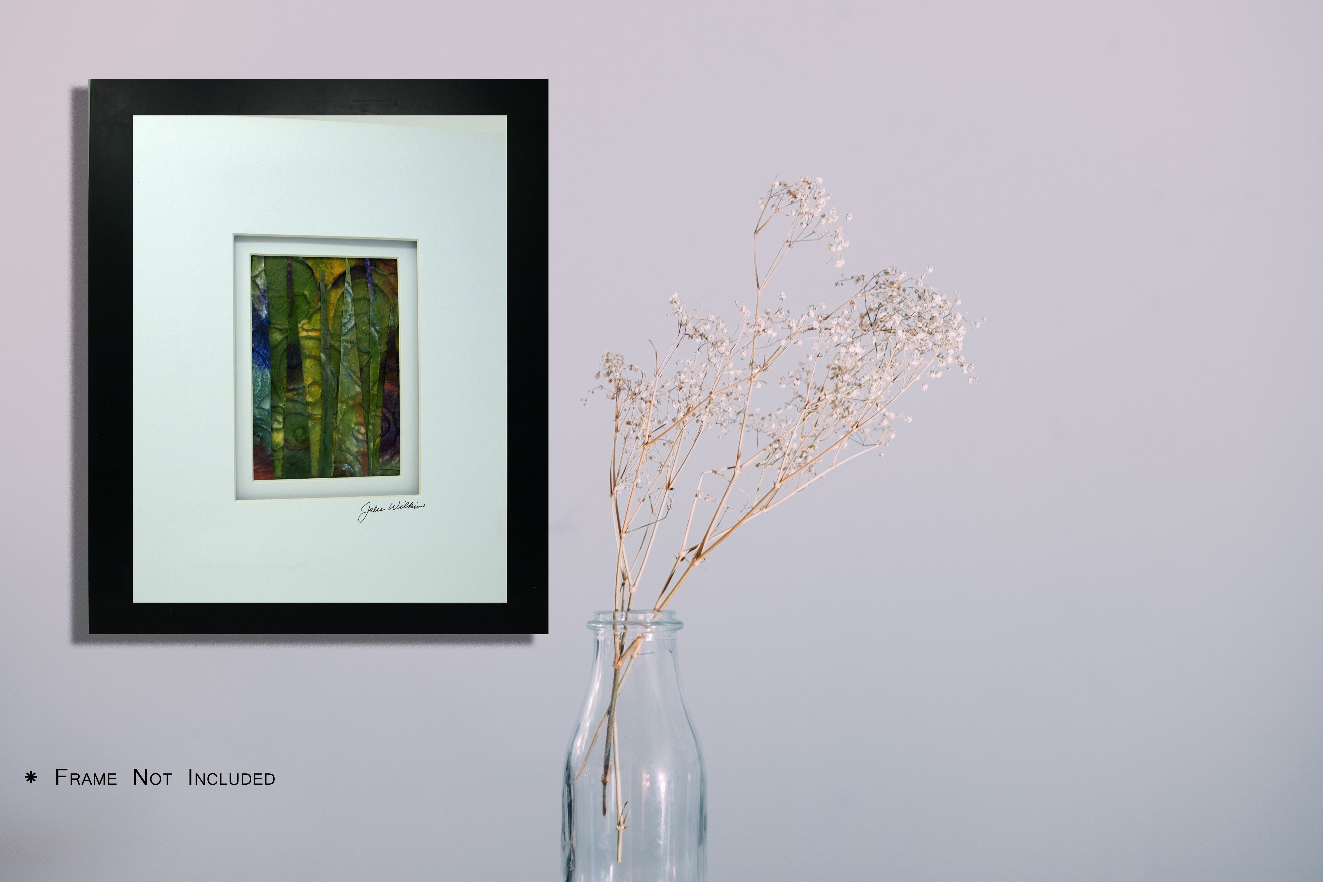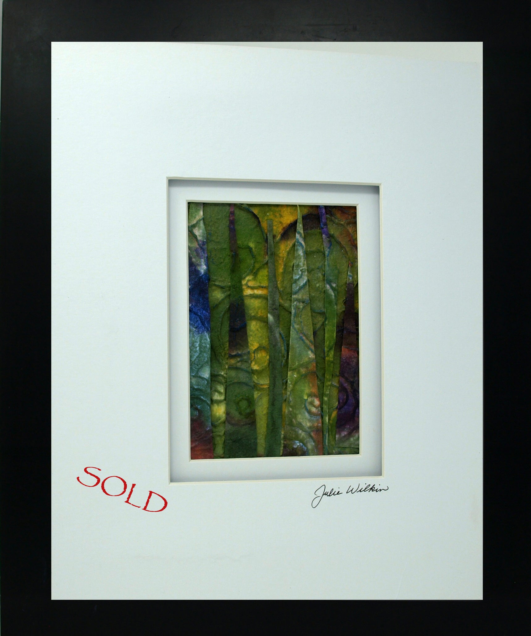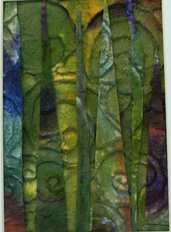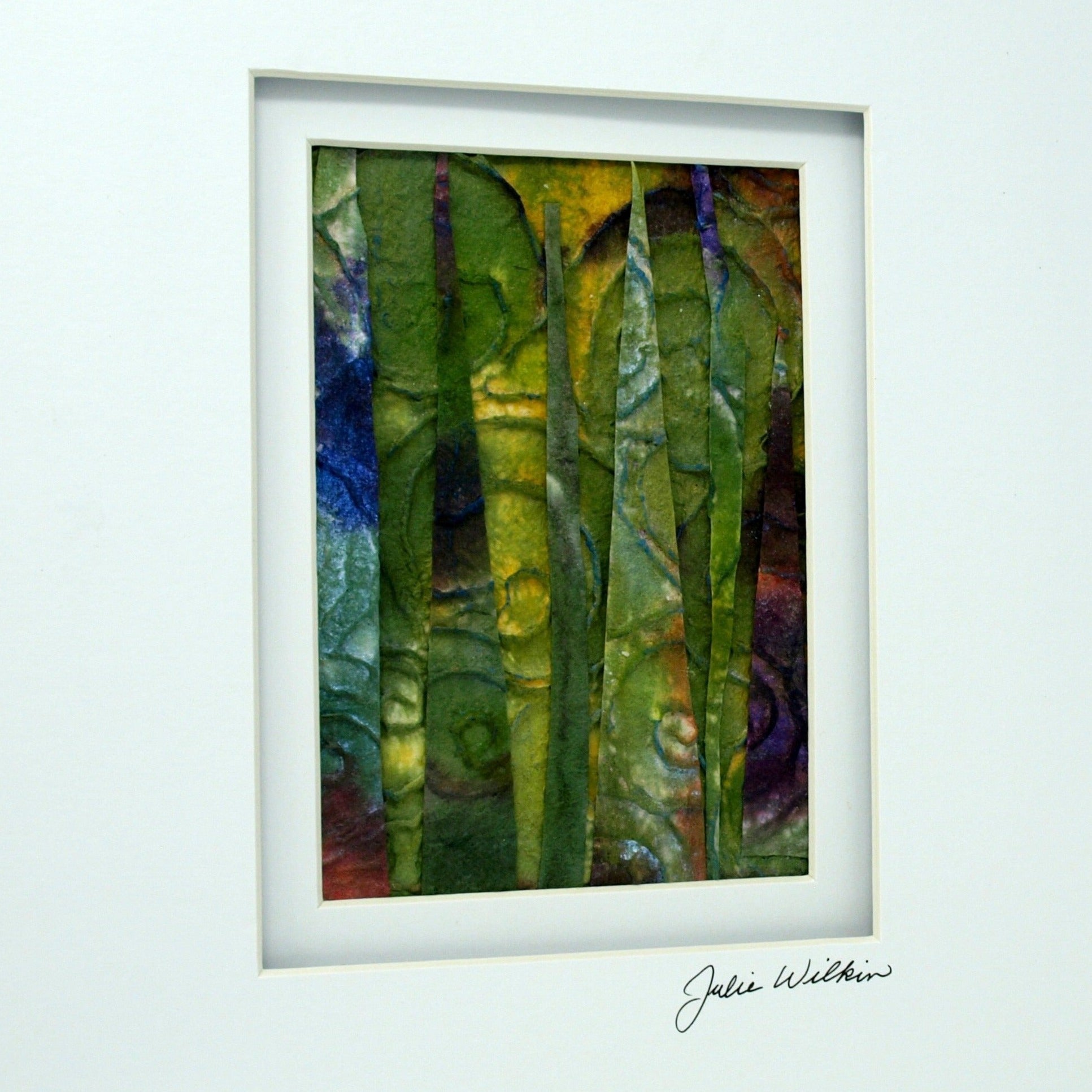 I seem to be attracted to all things to do with Silk!  Mulberry paper is made from the trees which silkworms love to eat. Hand dyed with some metallic paint here and there, I started to see the light (!) of the morning forest -- sun filtering  through the trees.  I hope you have a special spot which might need some morning sunshine for this little beauty!