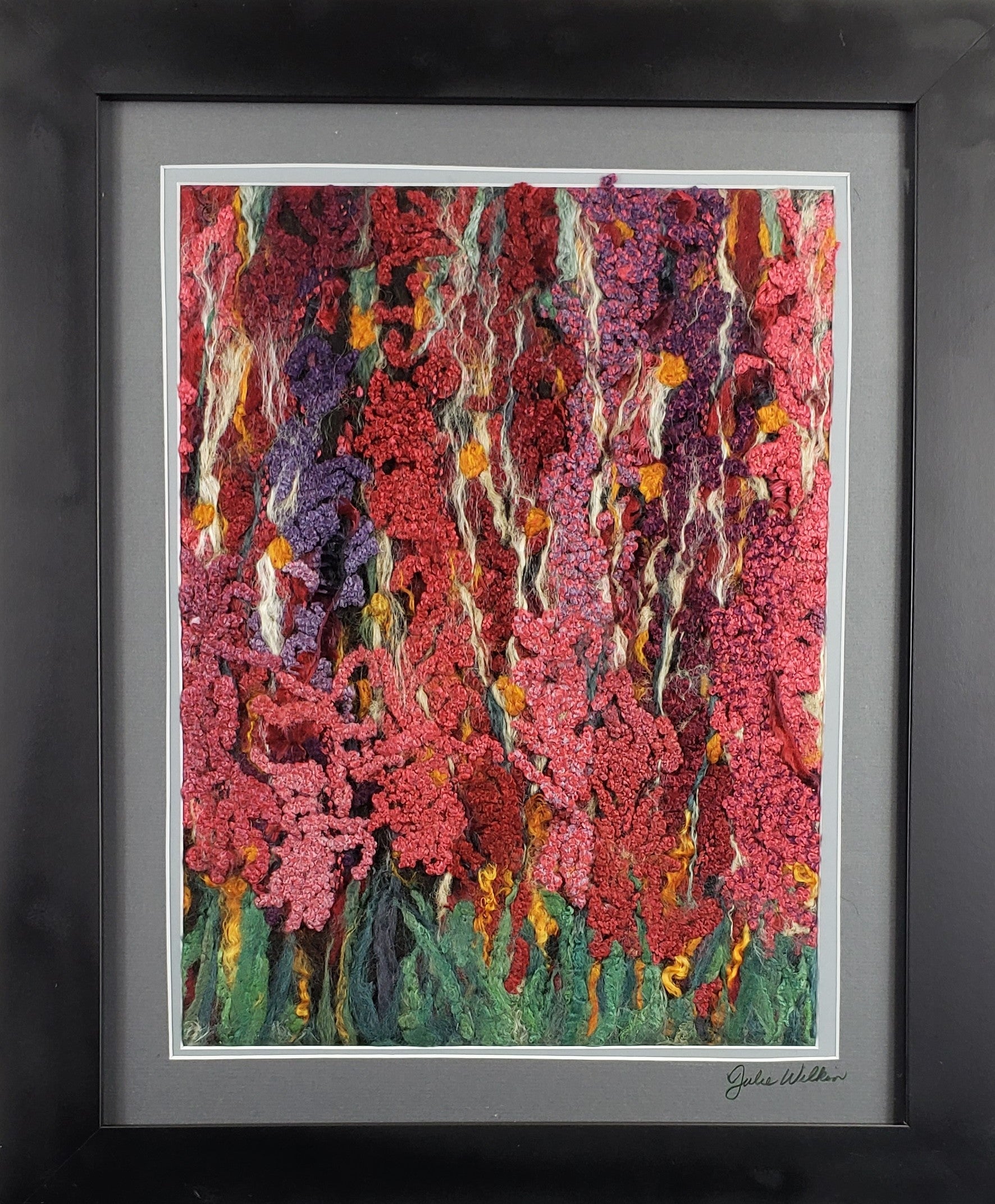 A slightly smaller version of Garden Delight, this colourful garden grew and flowered from an original piece designed to be a shawl! Once you start unleashing the wool rovings and fabric embellishments  you just have to go with the flow! Coupled with Silk hankies & Tussah silk strands --  all nuno felted, needle painted and meshed together into some Garden Glory! "14W X 17"L (with Included Matting 16" X 20")