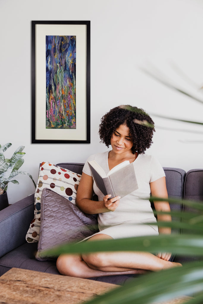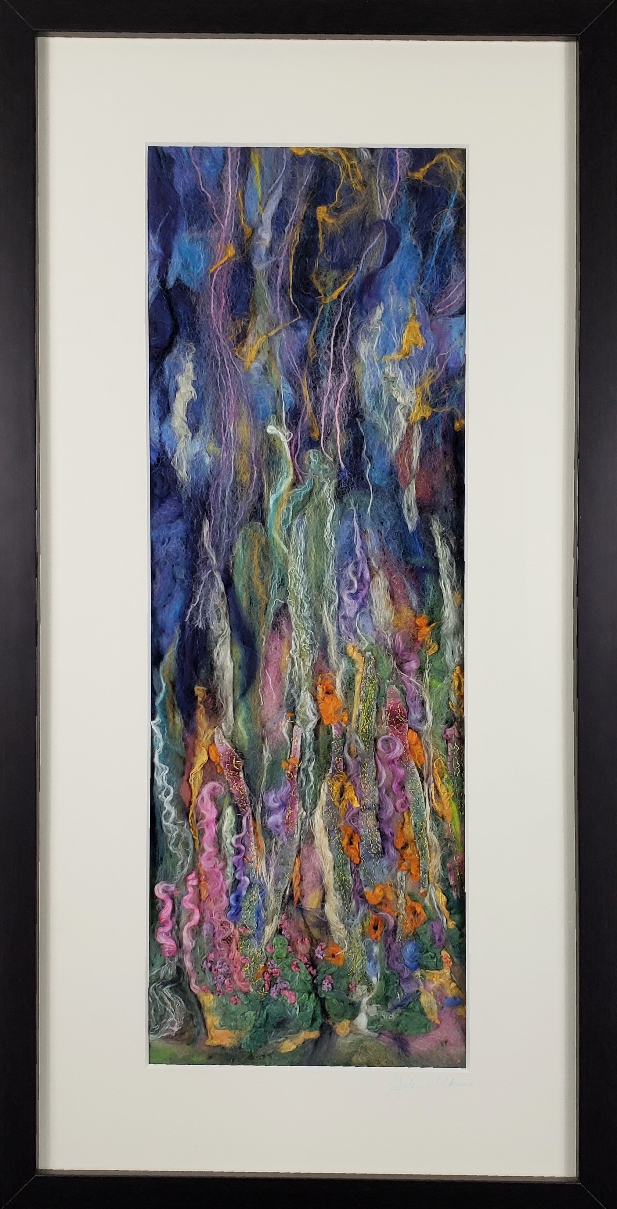 Fairies dancing on a moonlit night amongst the summer wildflowers --just use your imagination! Wool Rovings combined with Hand Dyed Silk & Threads, 16.5"W X 32" H (Frame, Matting and Glass included)