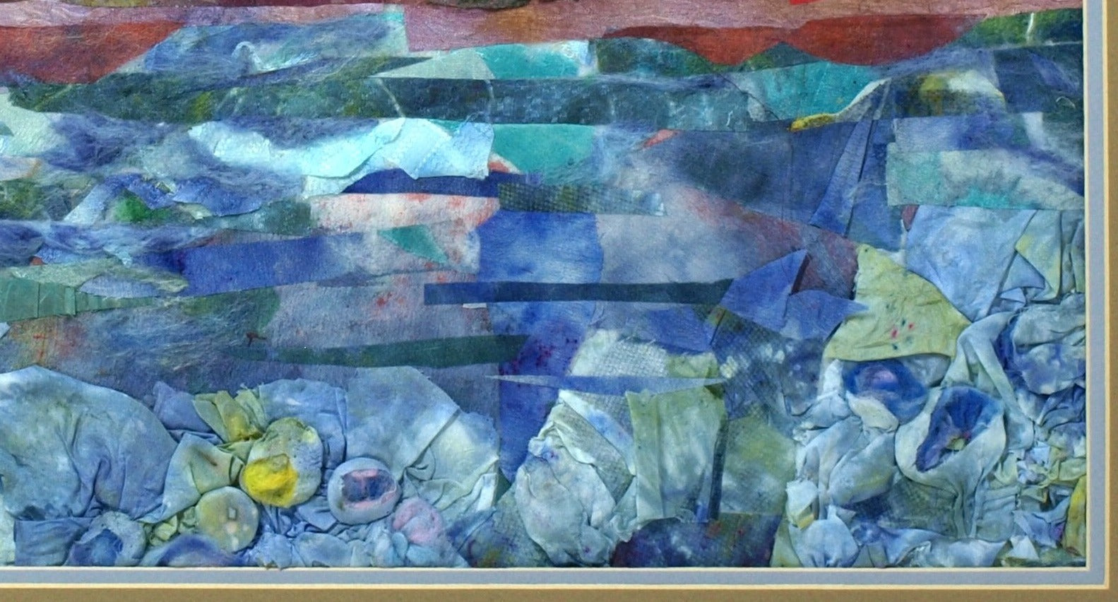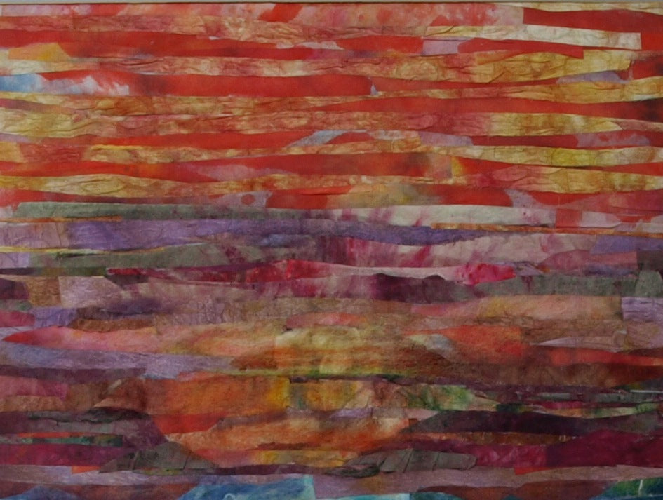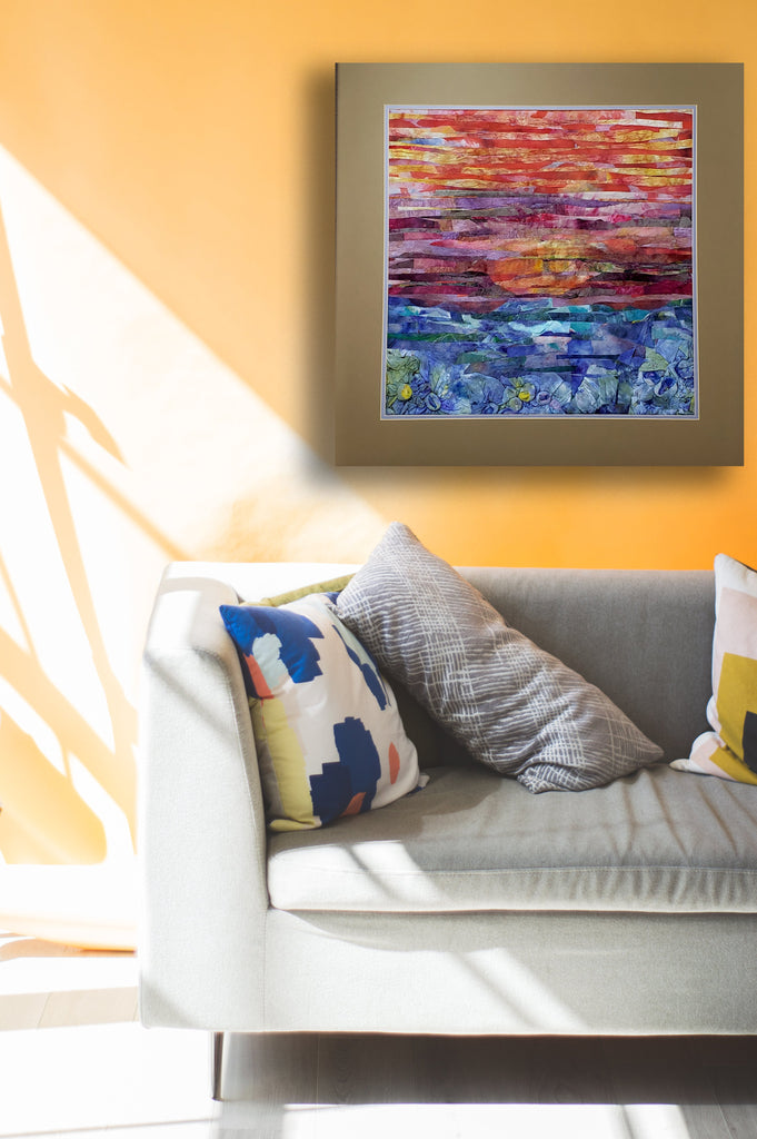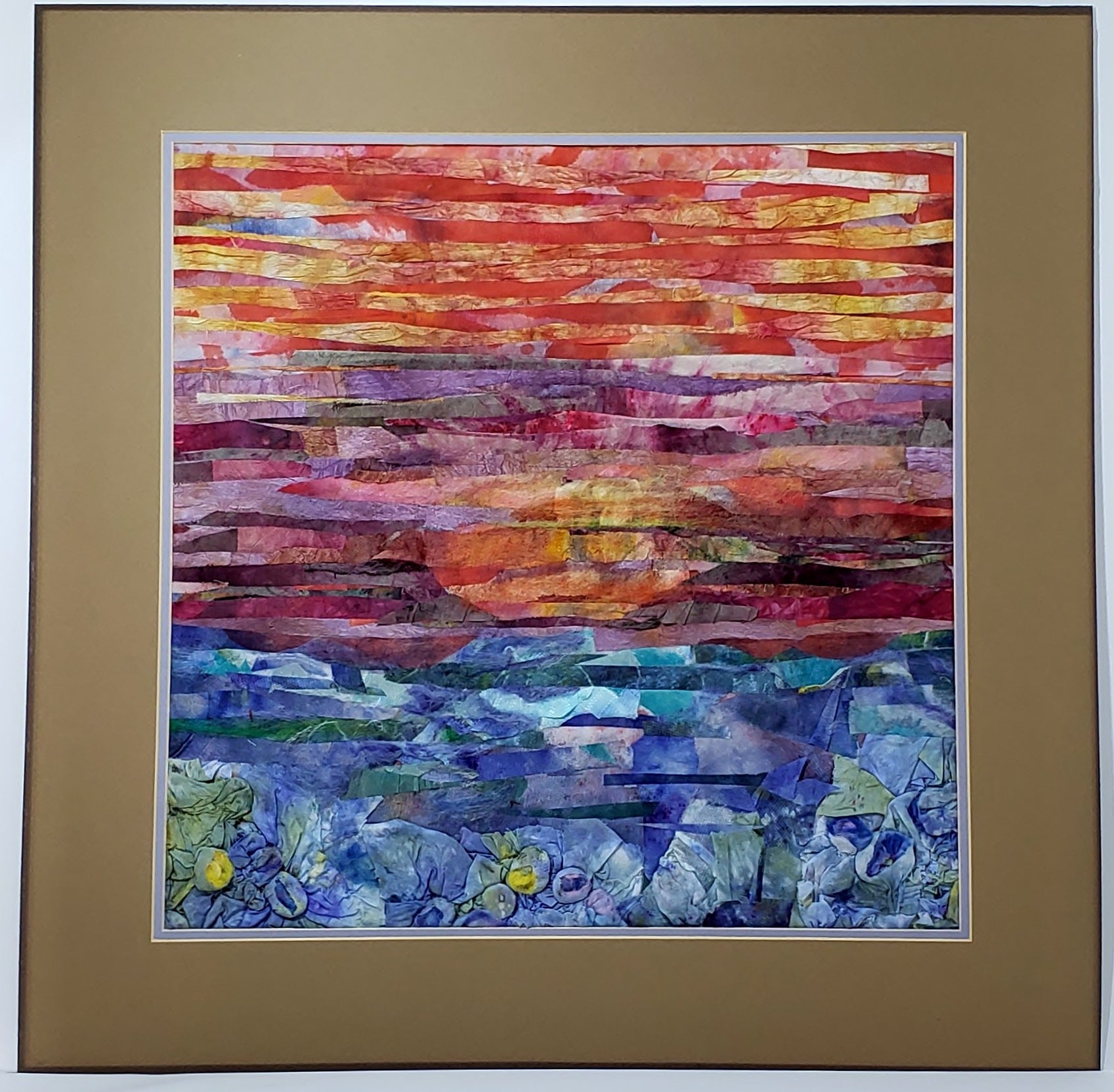 Beautiful leftovers from other artworks -- what to do? Well one piece led to another and before I knew it, I was creating another landscape! This collage of 100% Silk & Wool has so many radiant colours, hues, textures, & techniques it's a feast for the eyes. It will compliment any decor and hopefully make you smile every time you see it! 20" X 20" (26.5" X 26.5" with Matting which is Included)