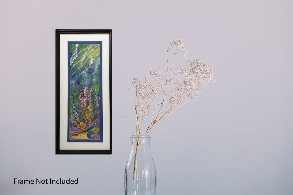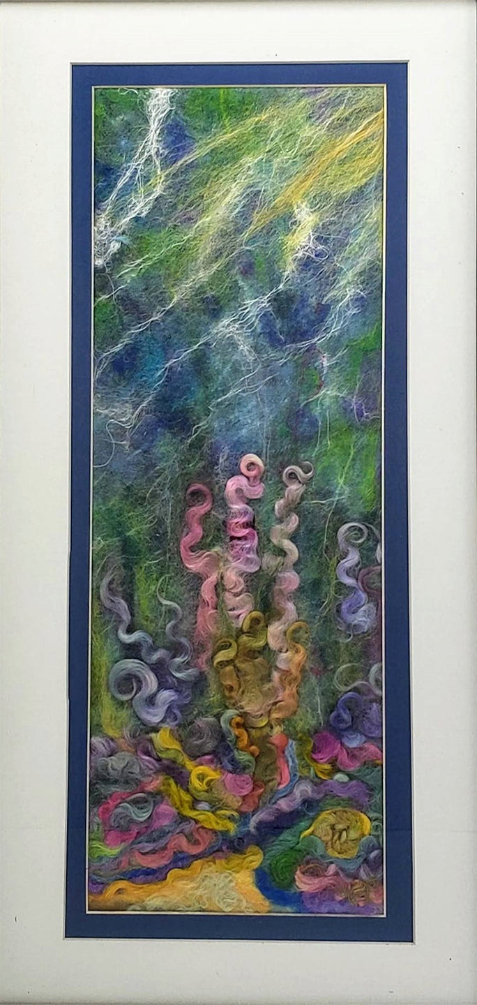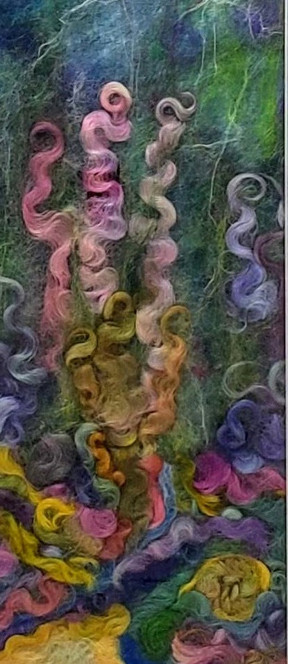 Take 100% white silk. Hand dye applying Shibori techniques.  Follow with Nuno Felting. When dry, needle paint with wool locks and unspun fibres.  That's all it took to create this colourful piece.  Yes it took a lot of time but it sure was worth it! Original measures 6" X 17" (  9.5" X 20" with Matting which is Included) Sorry I've found a new home!