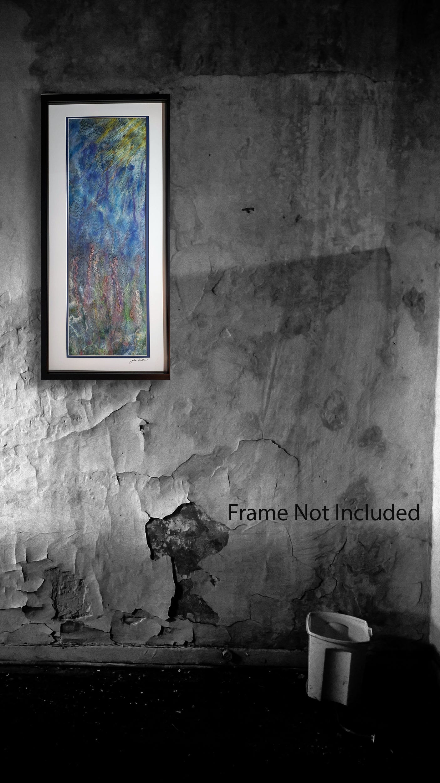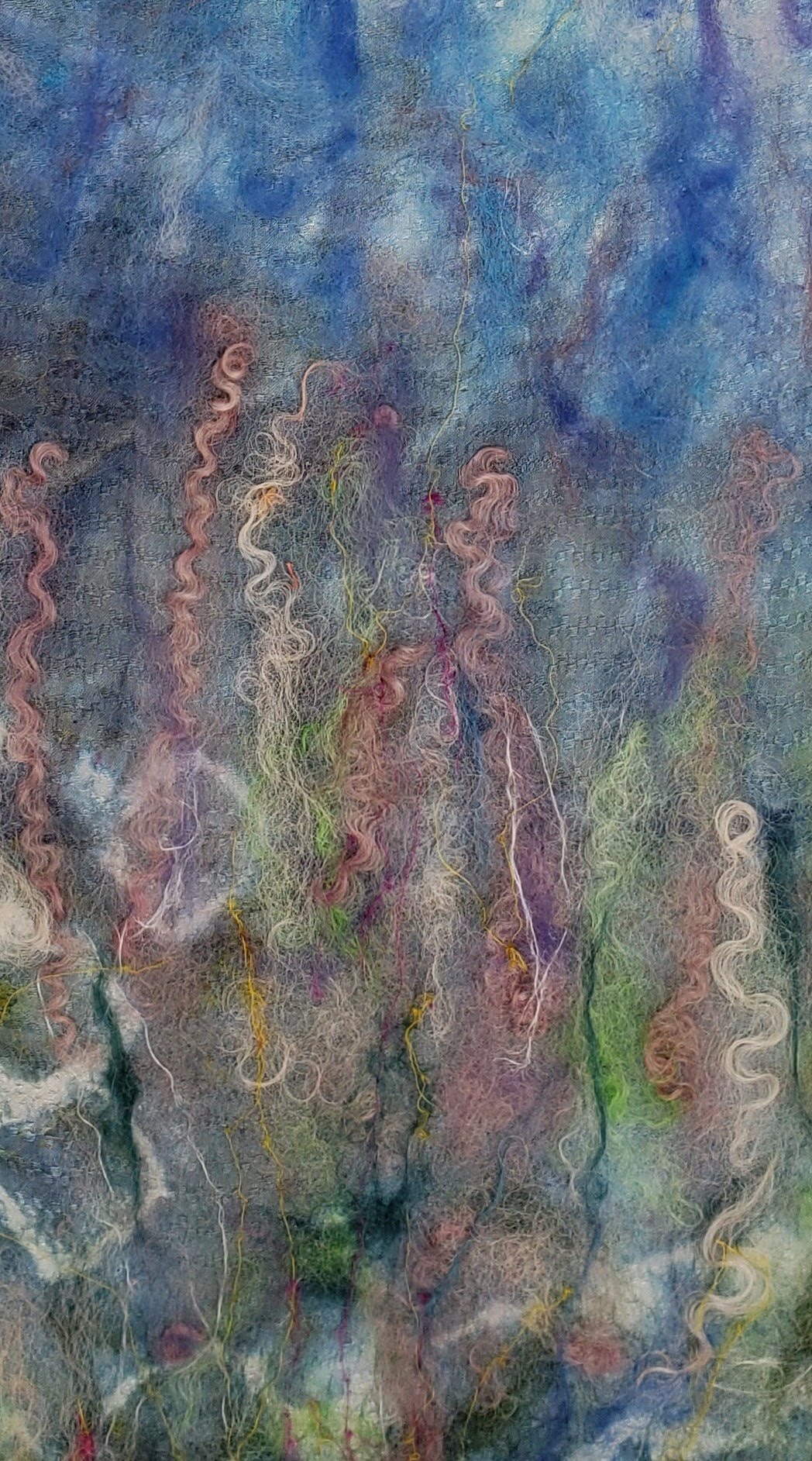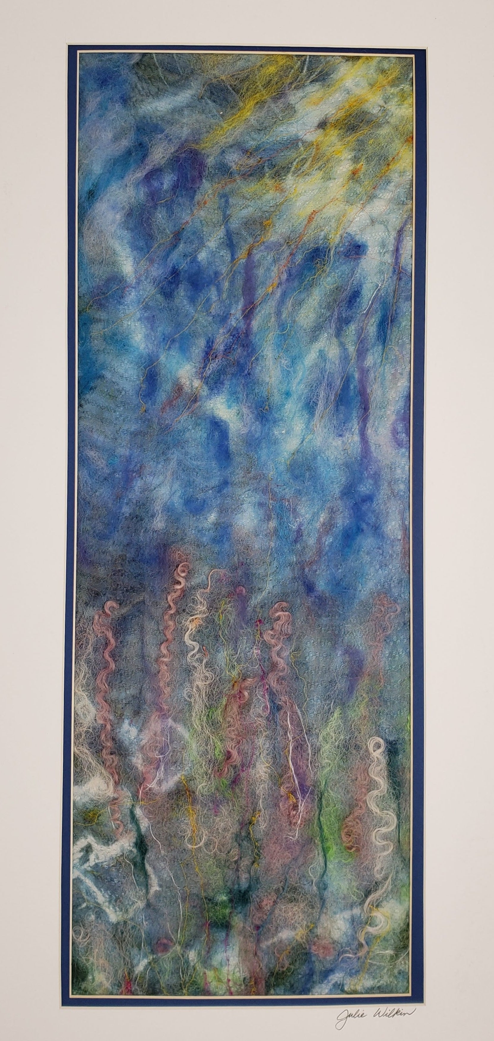 The misty beginning of a new summer day! Flowers reaching up to catch the warmth of the morning sun. These images evolve as the different colours and techniques of Shibori and Nuno Felting combine with the silk and unspun wool. 9" X 24" (13" X 27" with Included Matting)