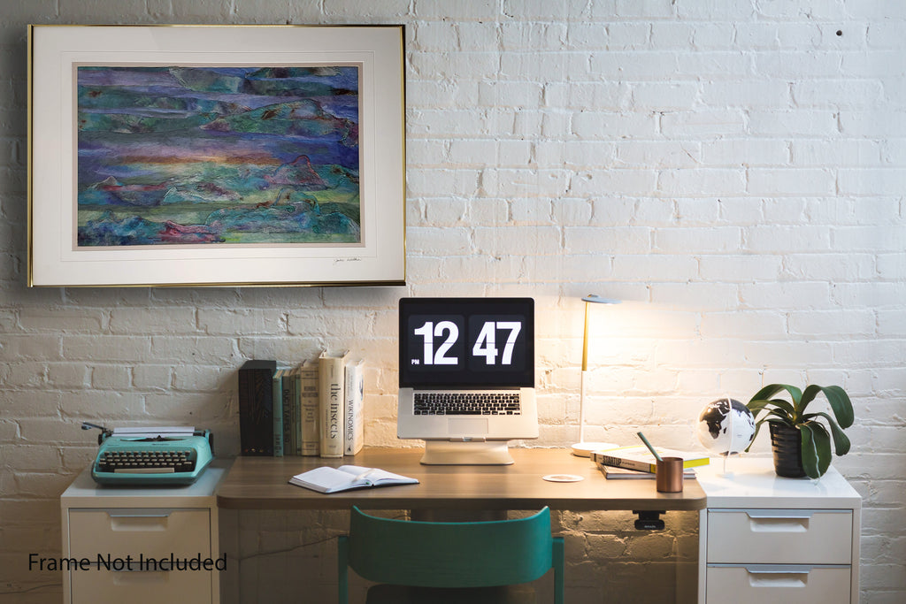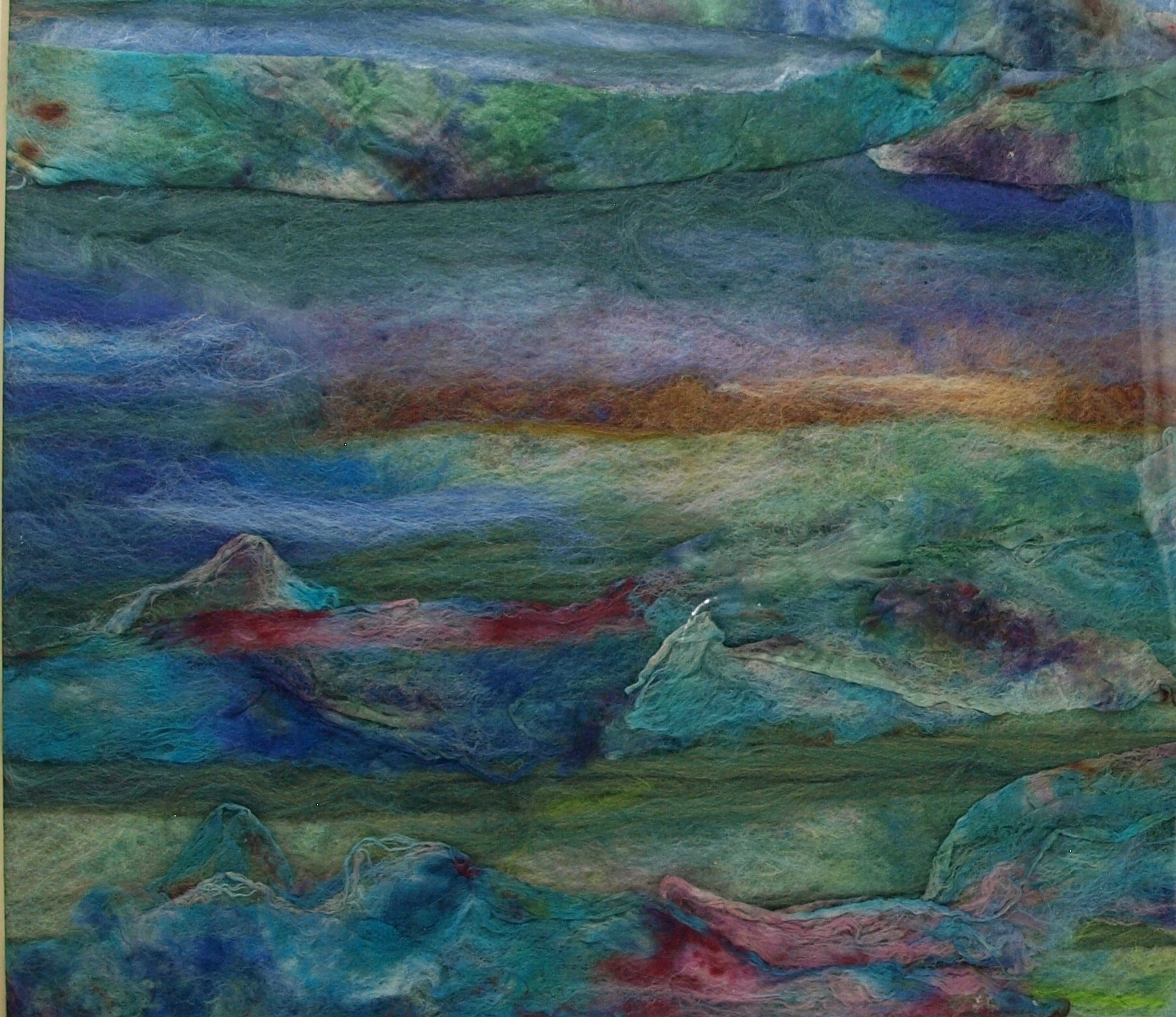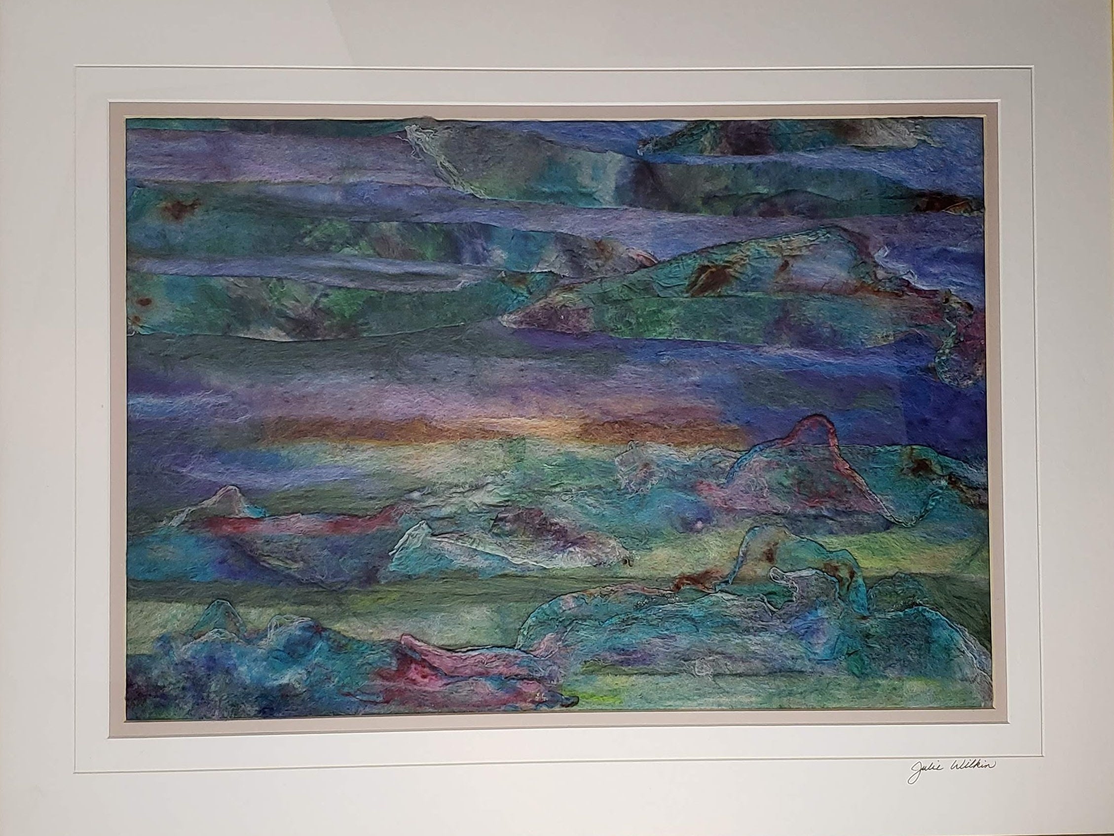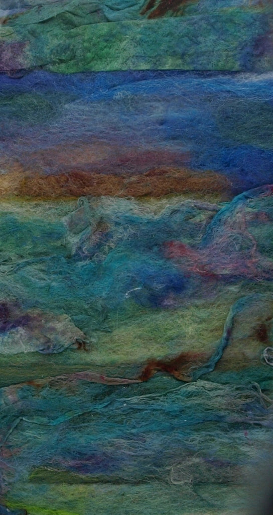 Sheep meets Silkworm in this piece which really came together once the hand dyed silk hankies were put into play! Created with wool roving and silk hankies (which come from the cocoons of the silkworm), this unique piece is truly One of a Kind! Original: 22.5" X 15.5" (29" X 22" with Included Matting)