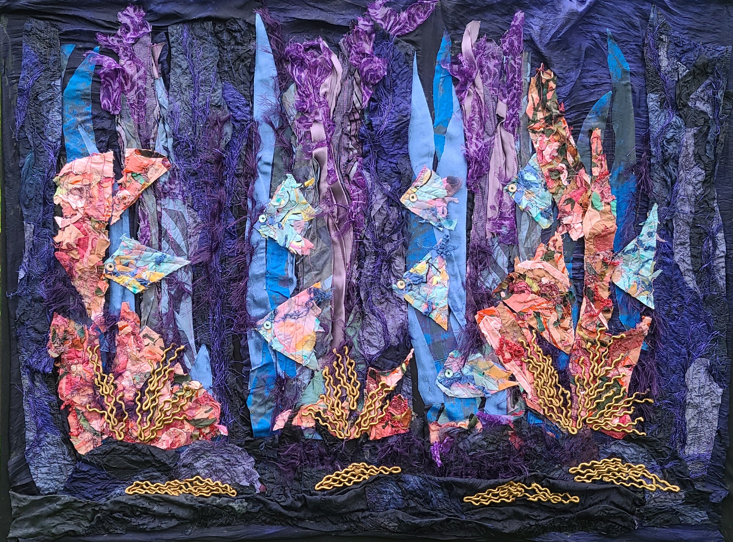 Colourful fish swimming amongst Coral reefs. So much to see when you take a dip in tropical waters! Silk Strands blend with Free Motion Stitching 24" X 36" on wrapped Canvas.