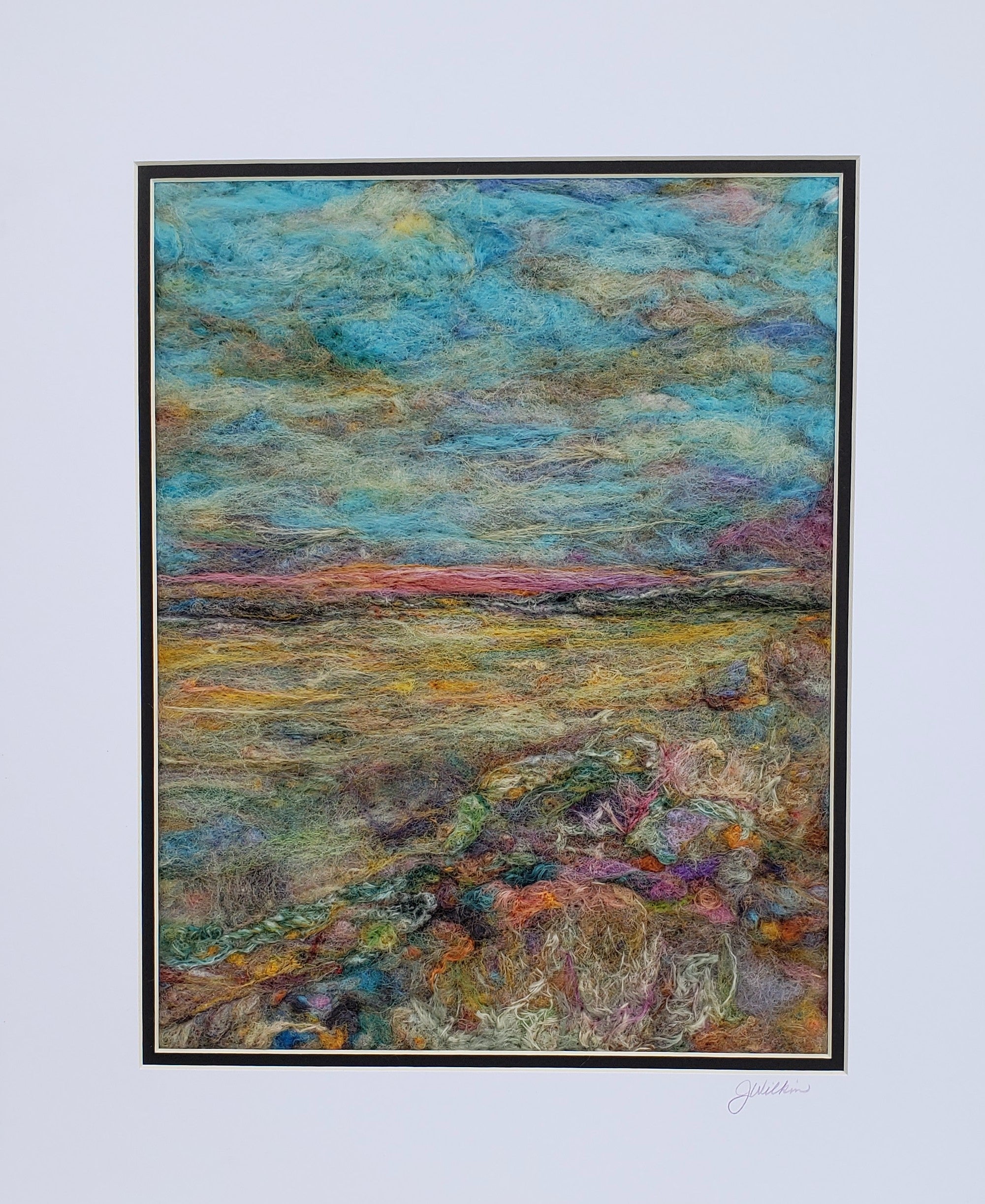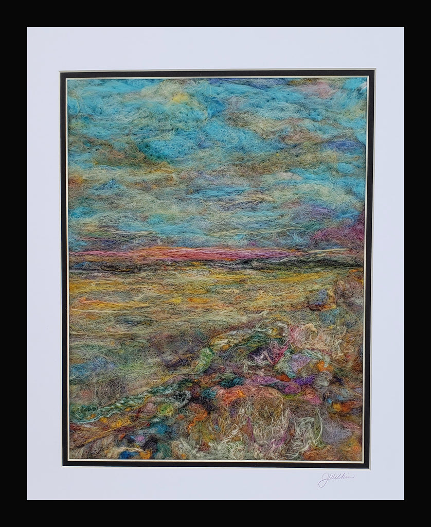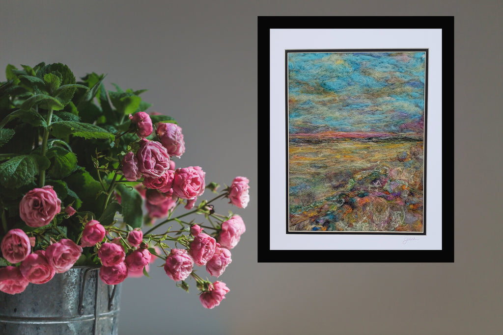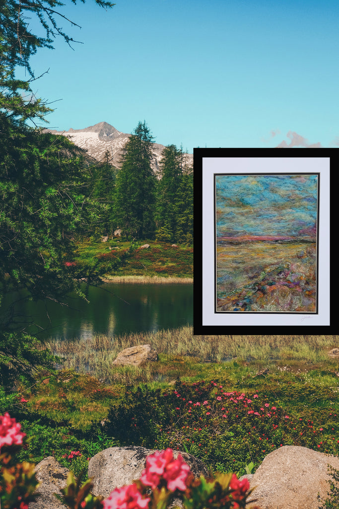 Double the pleasure when you can saunter along the waterfront while gazing at wildflowers blooming in the meadow! 100% Wool painting created with a ridiculous amount of needle poking! 16" X 20" (includes double matting)