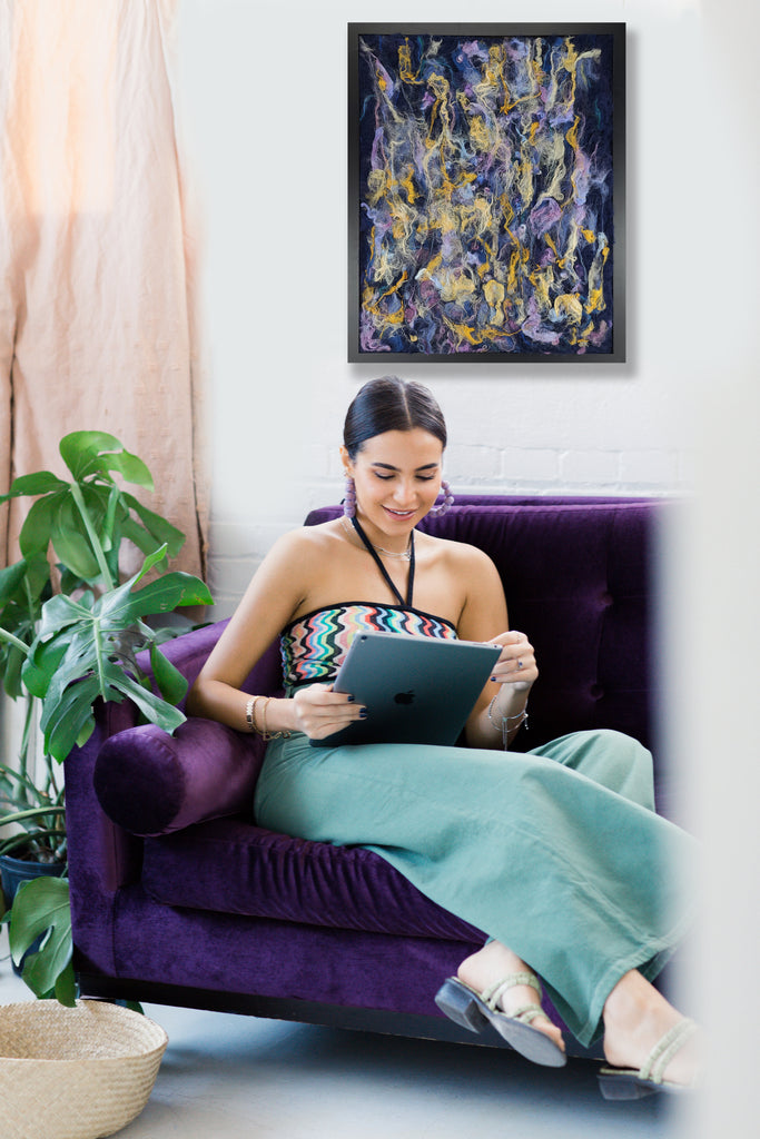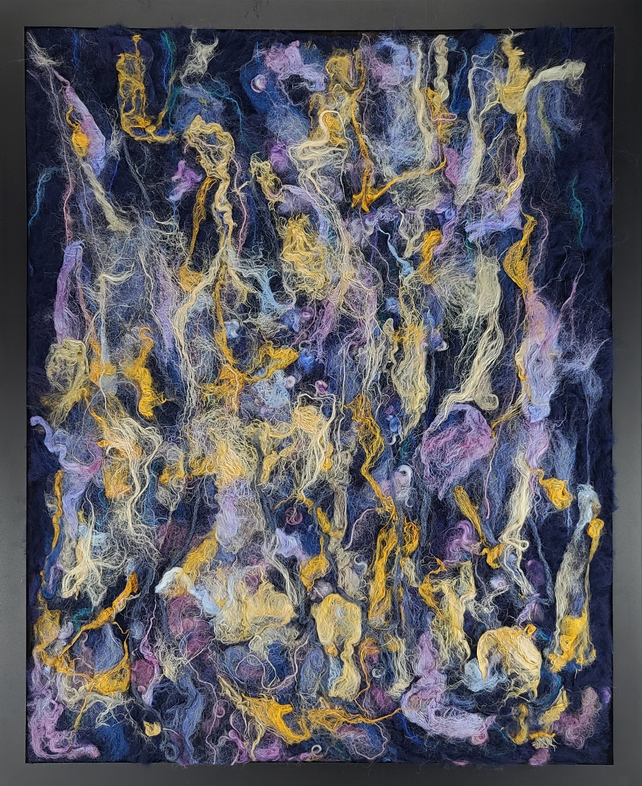 Nymphs are female spirits or goddesses associated with nature. Wild, untamed and celebrating the joy of life they tend to dance to their own tune! Created with 100% Wool Roving, Merino, and Silk Tussah strands along with Needle Painting techniques. 26" X 32" includes Frame and Glass