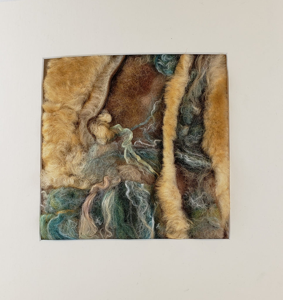 Whether you see layers of rocks or something altogether different this piece will enhance any space with its beautiful colours and textures. Created with Wool Roving, Tussah Silk strands & Sheepskin using Needle Painting techniques. 12" X 12"(includes matting) 7.5" X 7.5" (without matting) If your looking for a set, check out Strata 2 and Strata 3 - they are all beautiful as individual pieces or combined