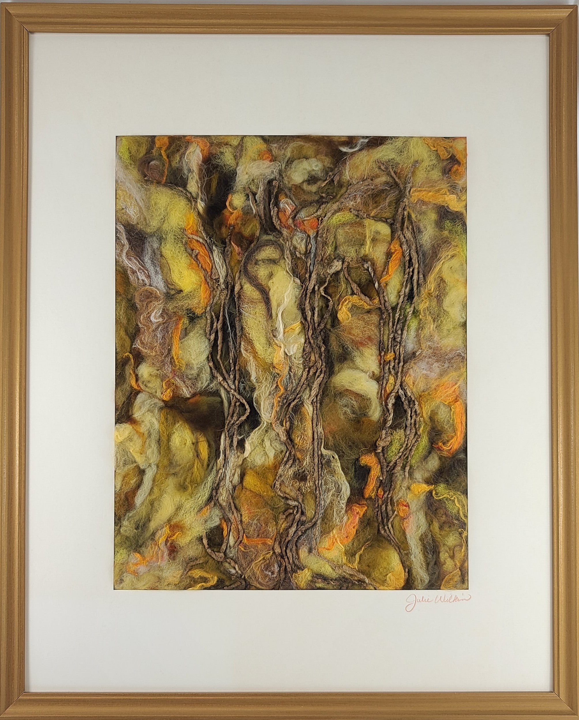 There's so much going on in this piece that I had to use a verb to describe it! Created with luxurious Wool Roving  and Silk  strands along with Needle Painting techniques. 17.5"X 21.5" (Includes Double Matting (16 X 20) and Frame)