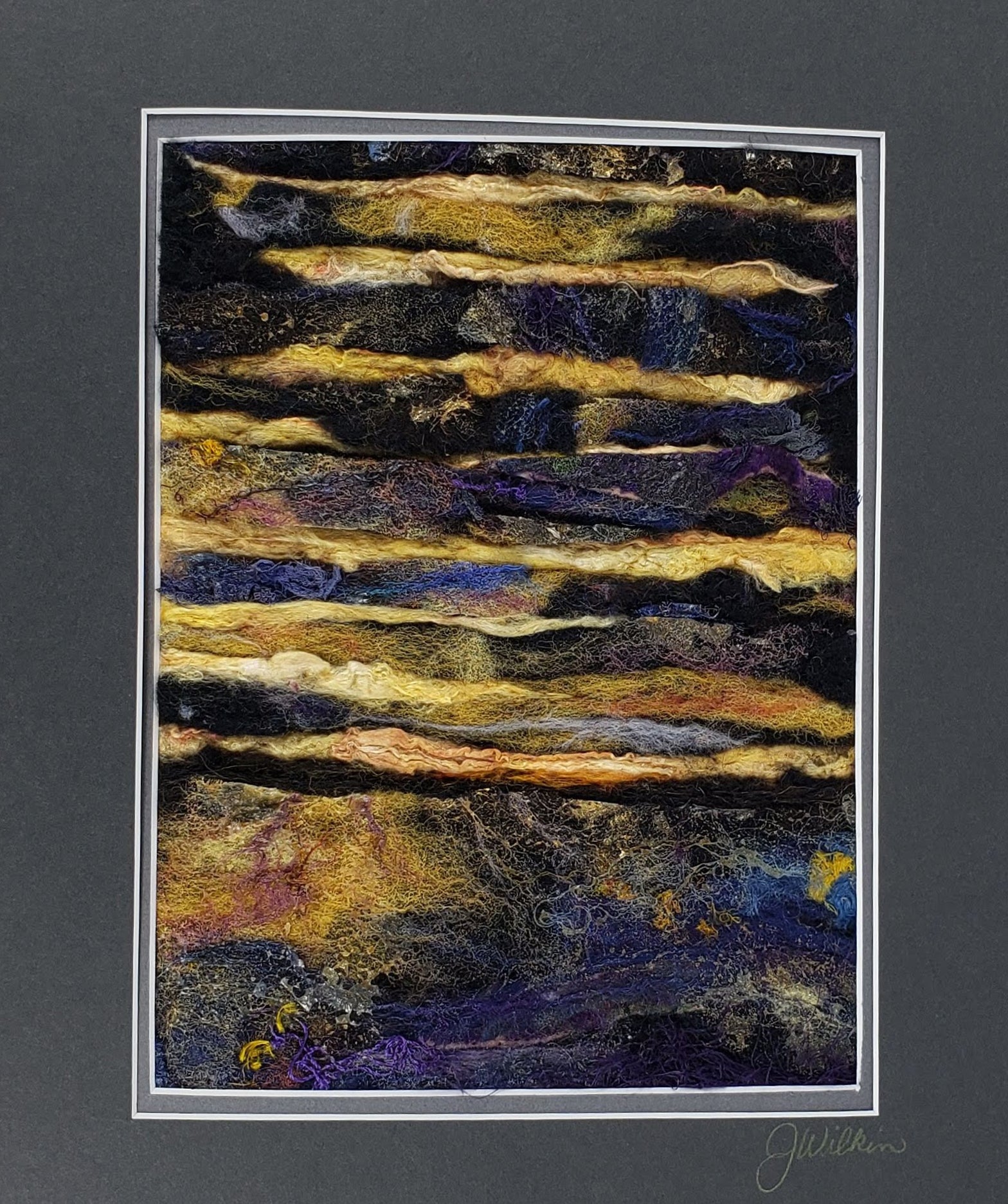 Natural Wool Roving, Tussah Silk Strands & Fabric Embellishments embrace Nuno felt & Needle Painting techniques to try and capture my favourite skies of the year!! 11" X 14" (mat and frame included)