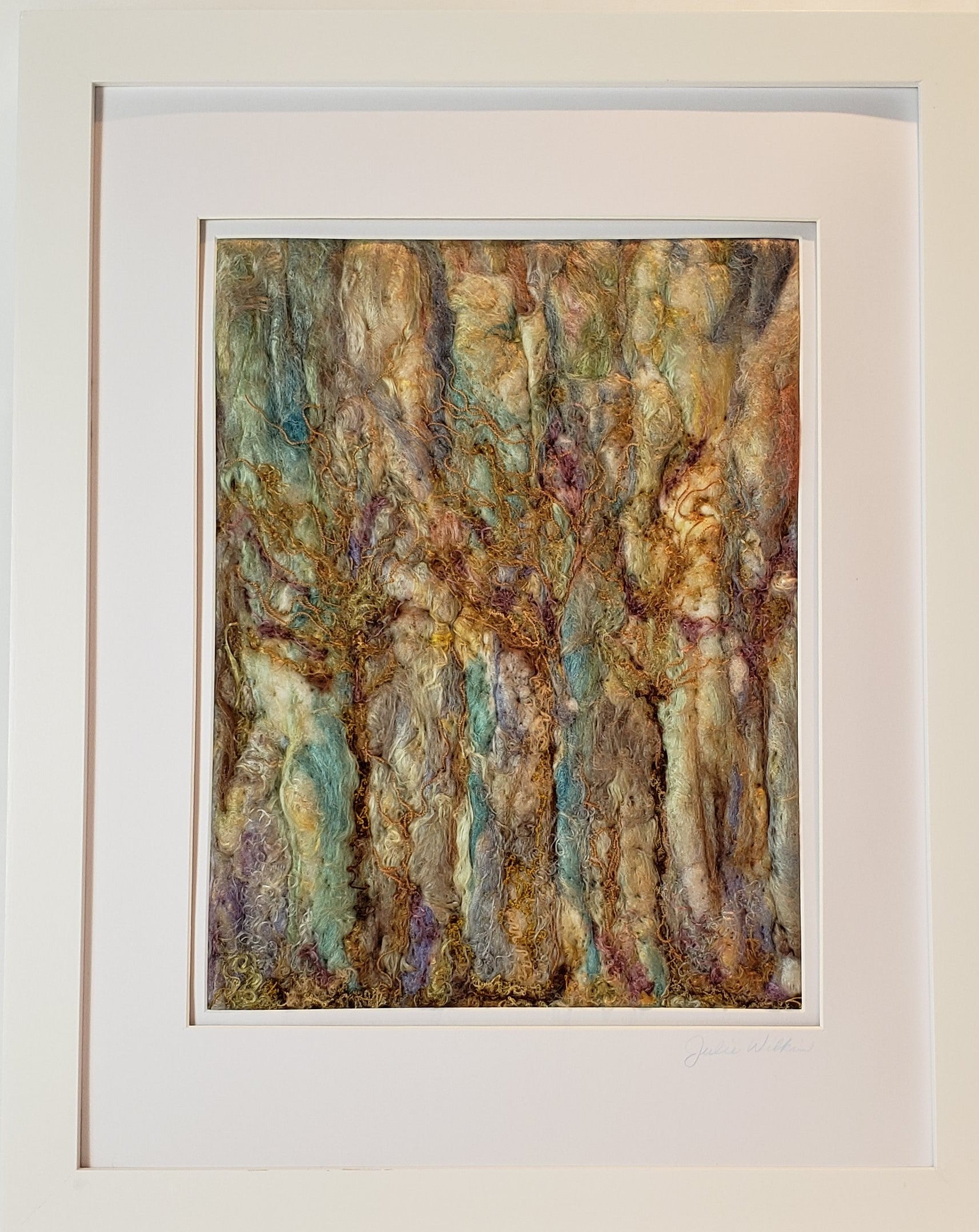 Long slender trunks embraced by colourful Autumn skies -- bare beauty! Wool painting techniques using Silk Tussah strands and Wool Roving. 16" x 20" (includes double matting, glass and frame)