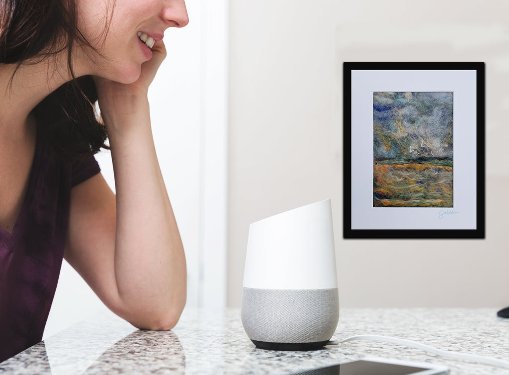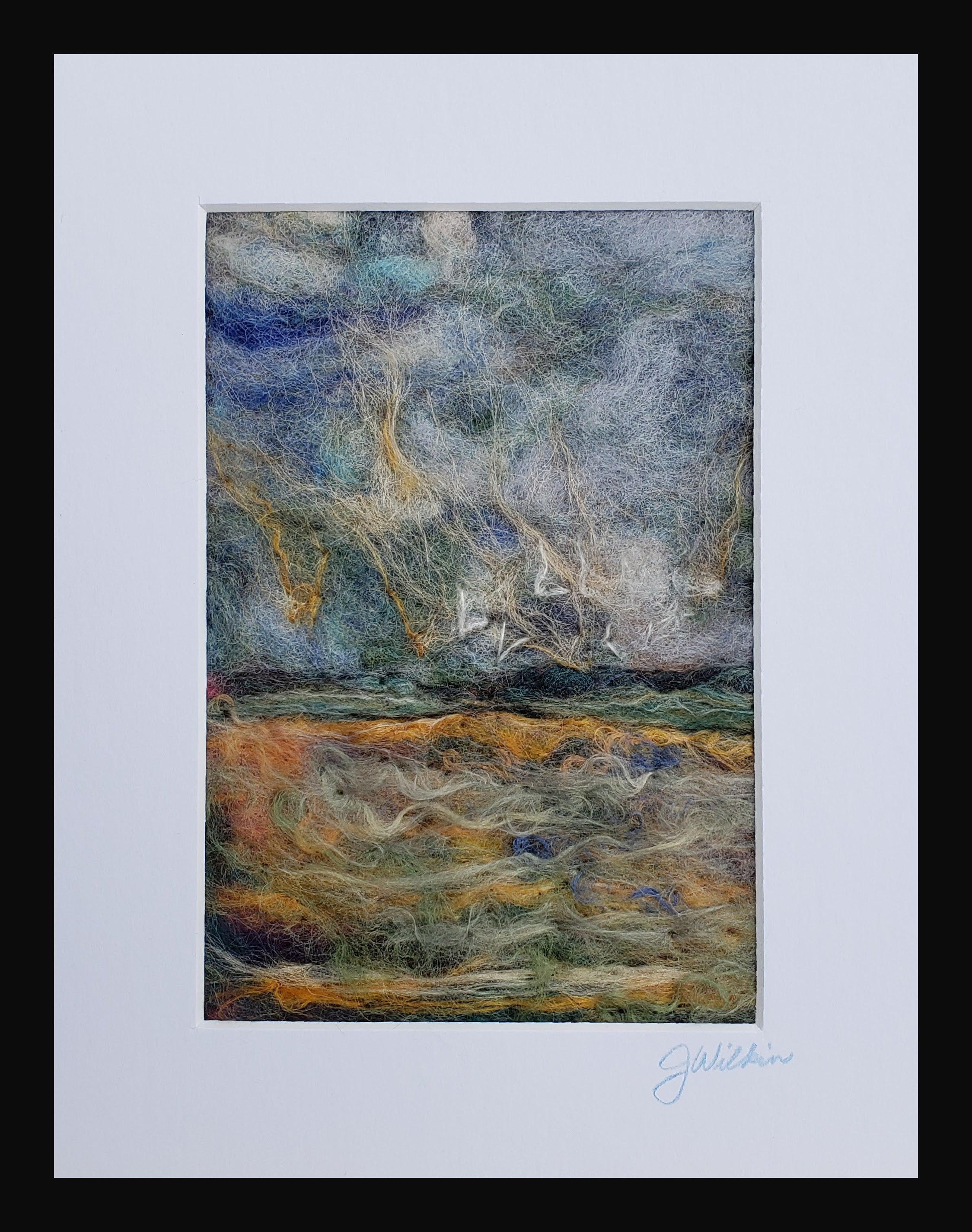 100% Wool Roving & Tussah Silk strands embrace Wool Painting techniques. 8" X 10" (includes matting and glass frame)