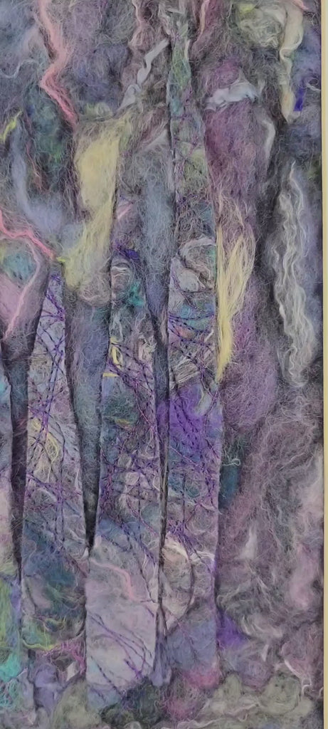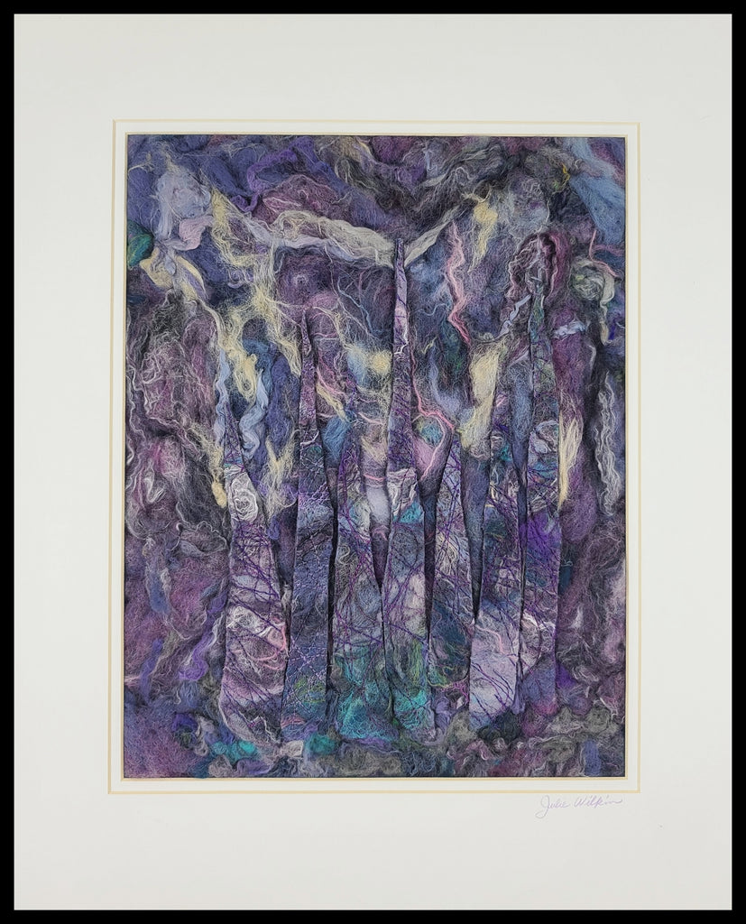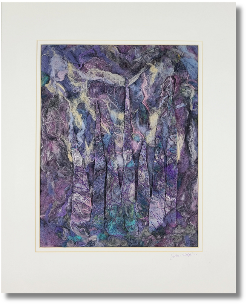 This is a slightly smaller version of Enchanted Evening but it still has all the vibrancy and luxurious twists and turns. 100% Wool Roving 16" X 20" Double Matted (Frame not Included)
