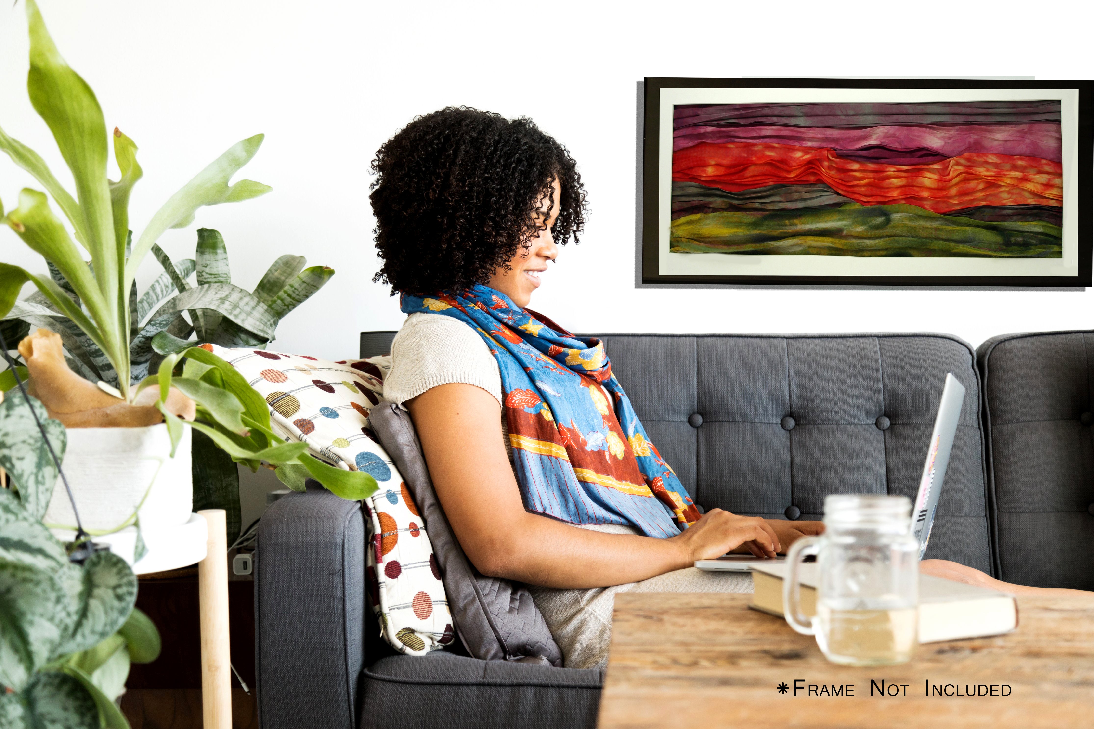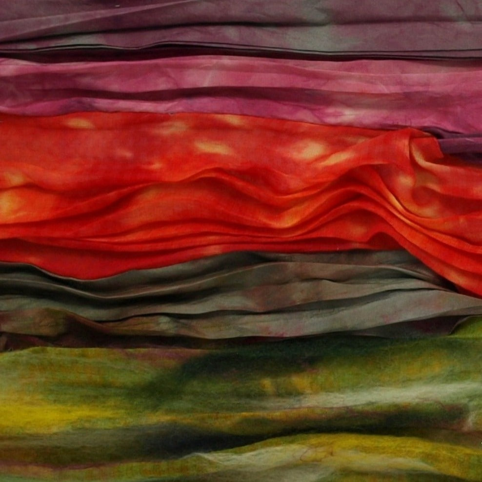 One of my signature pieces which evolved from playing with different techniques! Some Shibori tie dye, followed with Nuno felting and finished up with wool roving -- so exciting to see how the plain white silk transforms before your eyes!  100 % Silk Original Measures: 28"L X 12"W (Includes Matting)