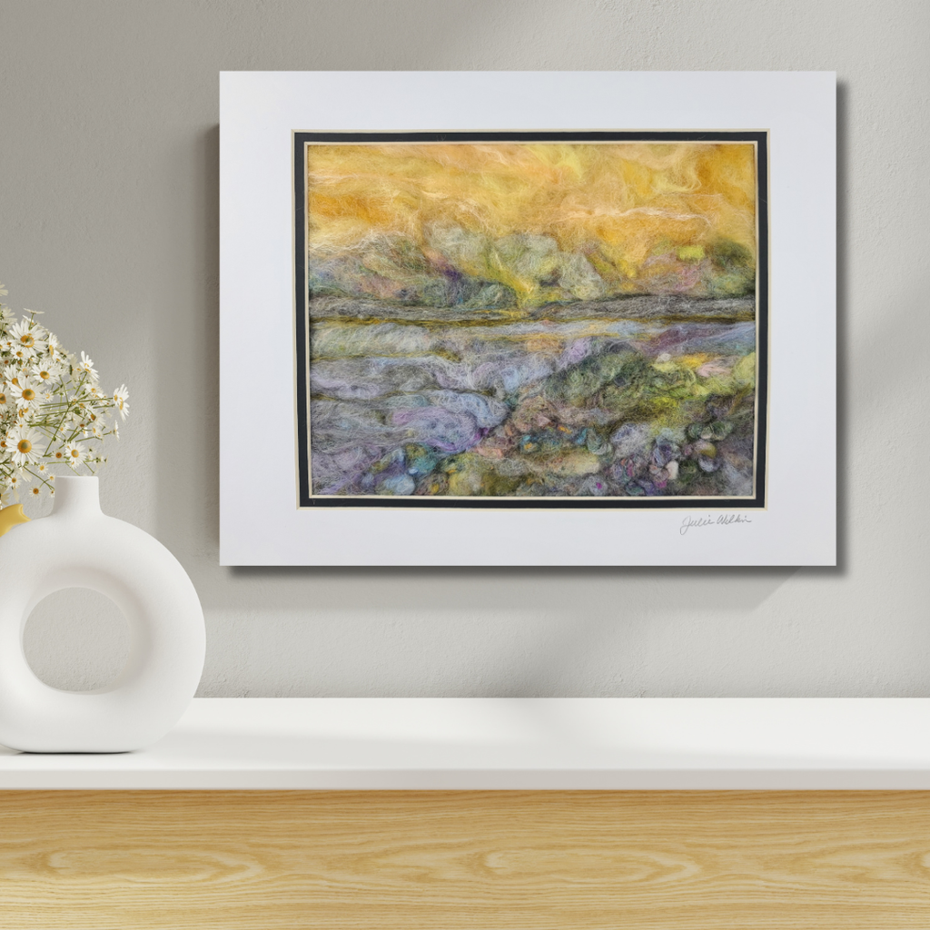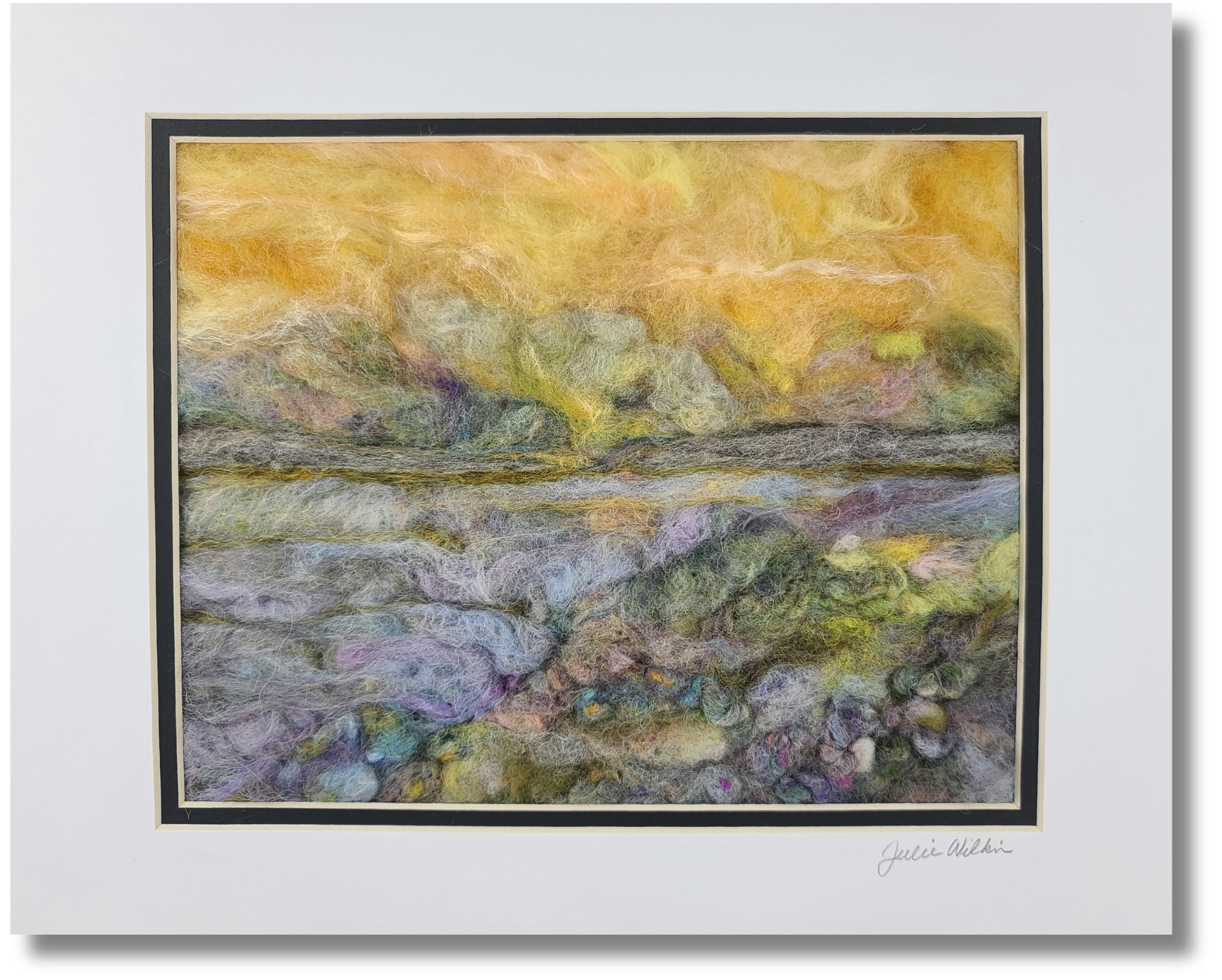 There are so many colours within a landscape that it's impossible to choose just one.  This piece, along with the other two in the series,  tries to capture all the light and colour Mother Nature paints with every day.  Created with luxurious 100% Wool roving  using Needle Painting techniques.  11" X 14" Double Matting included.