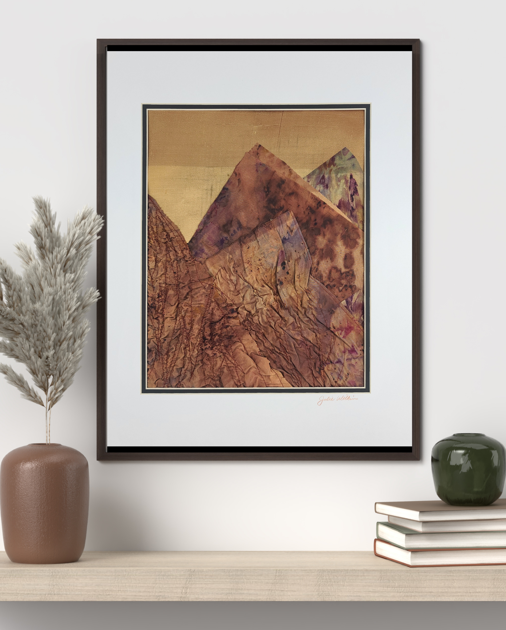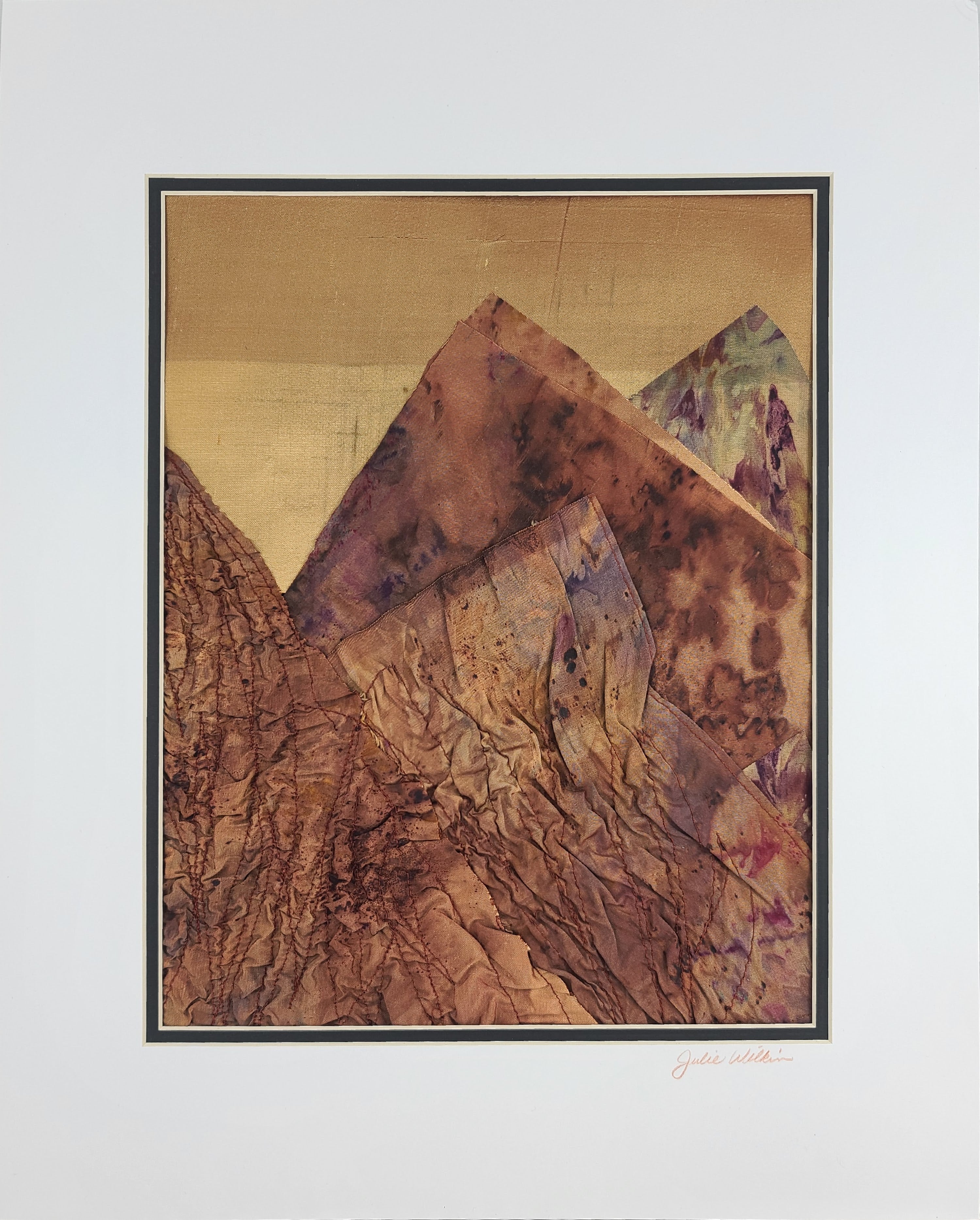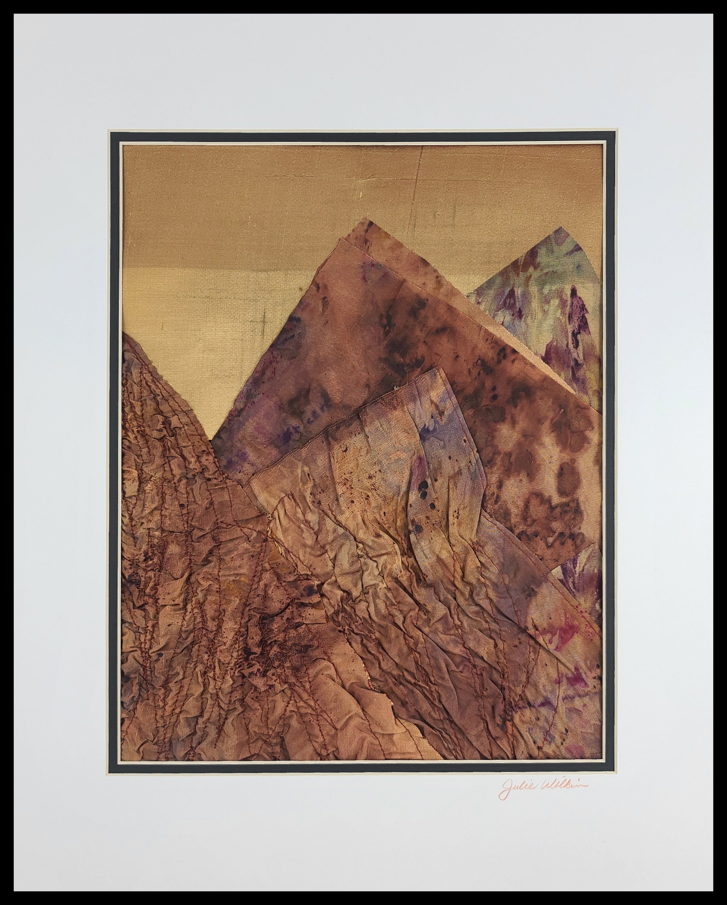 Bring the breathtaking drama of mountain landscapes into your home with Mountain Summit. This piece showcases luxurious hand-dyed silk transformed through traditional Shibori and stitching techniques, where each fold and stitch creates one-of-a-kind patterns that celebrate nature's grandeur. Measuring 16" x 20", double matted, ready to frame and display.