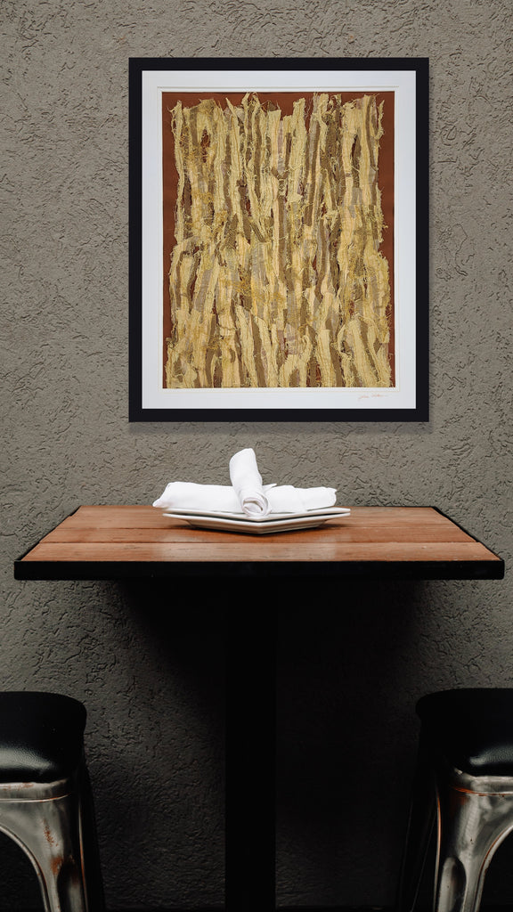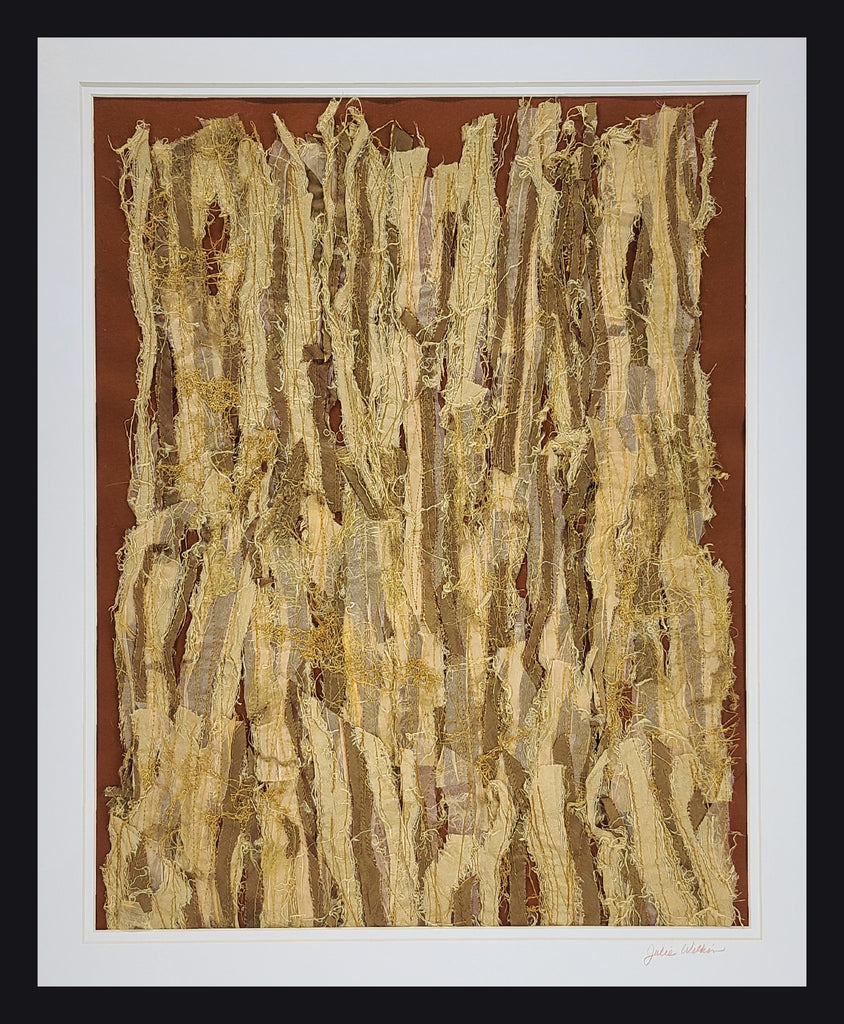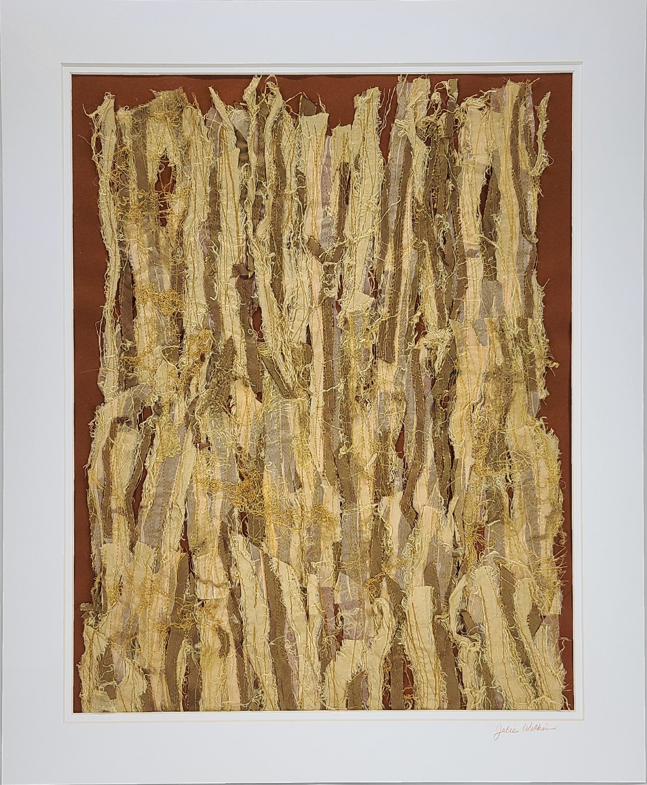 The lonely tree stump, hinting at a tree's past life along with the potential for renewal. Grains and cracks, peeling bark -- if only they could talk! Created with Silk and Threads coupled with Free Motion Stitching techniques. 20" X 24" Double Matted (Frame not included)