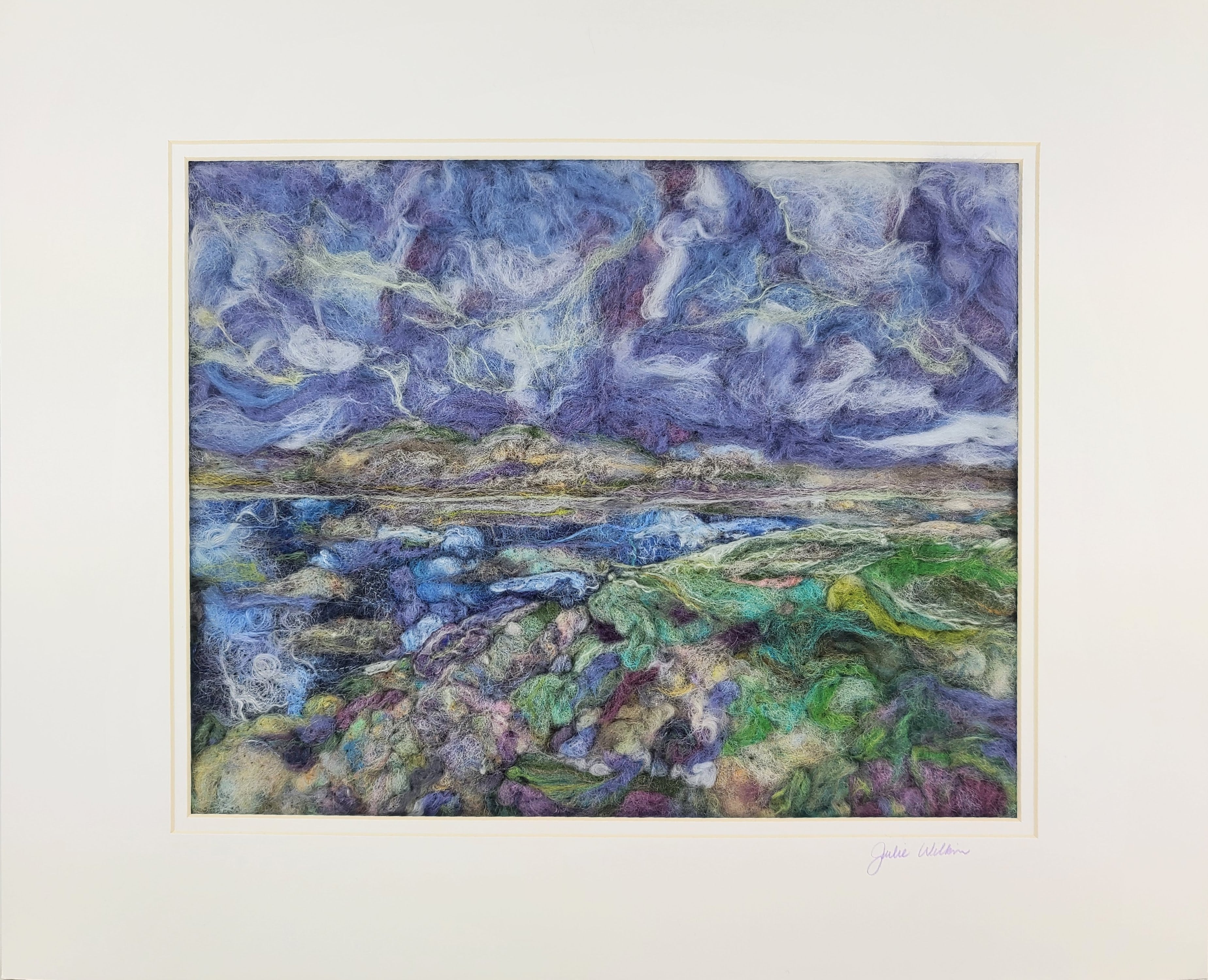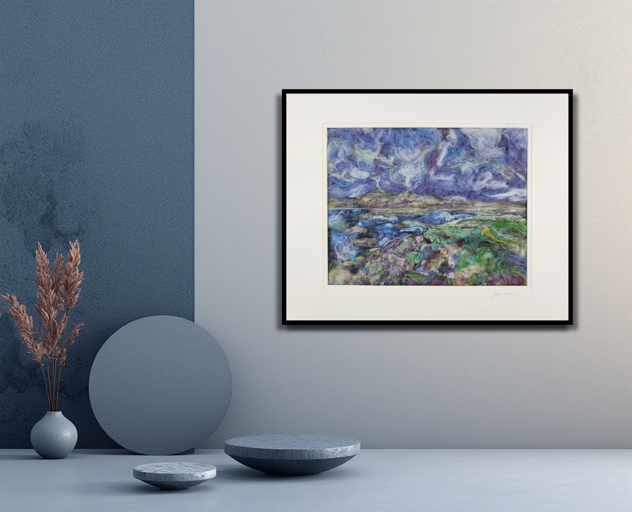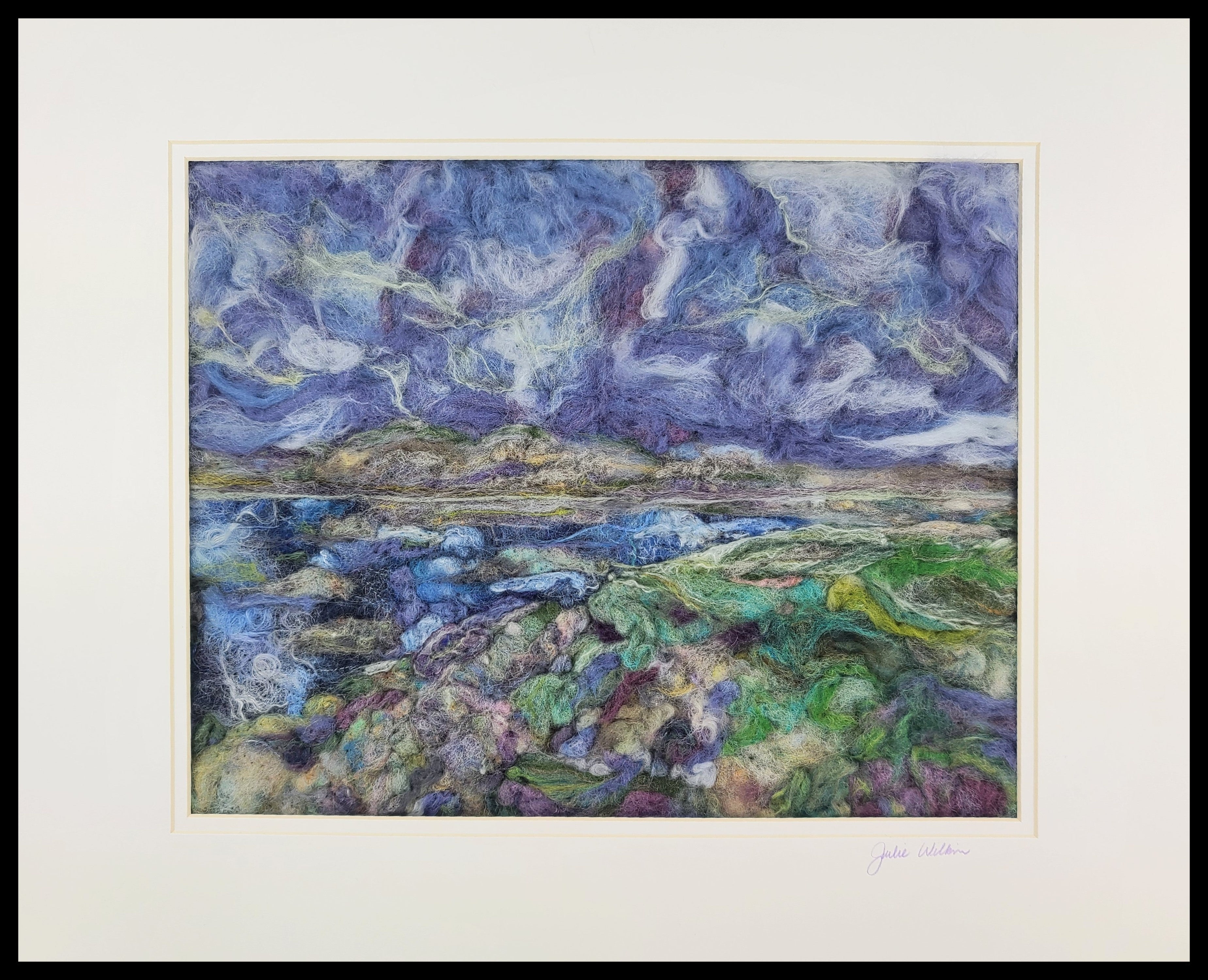 The phrase "Into the Wild Blue Yonder" captures the essence of exploration and limitless potential. Handcrafted with Premium Wool Roving and Needle Painting techniques this piece is sure to beckon the viewer and add colour and interest to any decor. 100% Wool Roving 16" X 20" Double Matting included.
